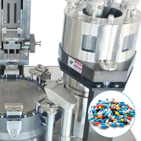 Fully enclosed dosing stations and rotating table for integration of the whole capsule filling plants.Large cam mechanism keeps the rotating table of moldtogether with the whole equipment running with balance, and completely guarantees the machine operating with highest precision and accuracy.1.Capsule orientation and separation2.Reserved work position3.Free for an optional pellet or tablet station 4.Dosing station for powder, pellets .5.Free for an optional pellet or tablet station 6.Faulty capsule rejection 7.Reserved work position 8.Capsule closing9.Qualified capsule ejection10.Segment cleaning with compressed air