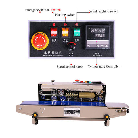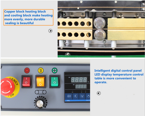 Features: 1. Adopt stepless speed control and electronic thermostat control device transmission mechanism. 2. Its sealing length is not restricted, high efficiency, reliable sealing quality, reasonable structure, easy to operate and so on. 3. Suitable for sealing packaging of various bags,and can connect with kinds of packaging lines. 4. Need to be heated before use.