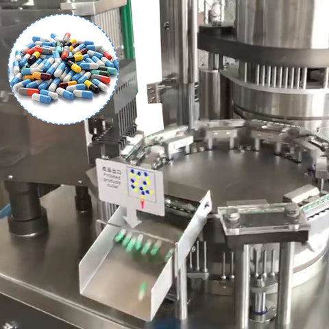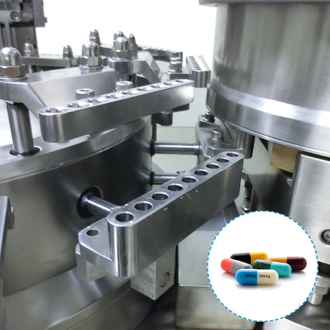 Fully enclosed dosing stations and rotating table for integration of the whole capsule filling plants.Large cam mechanism keeps the rotating table of moldtogether with the whole equipment running with balance, and completely guarantees the machine operating with highest precision and accuracy.1.Capsule orientation and separation2.Reserved work position3.Free for an optional pellet or tablet station 4.Dosing station for powder, pellets .5.Free for an optional pellet or tablet station 6.Faulty capsule rejection 7.Reserved work position 8.Capsule closing9.Qualified capsule ejection10.Segment cleaning with compressed air