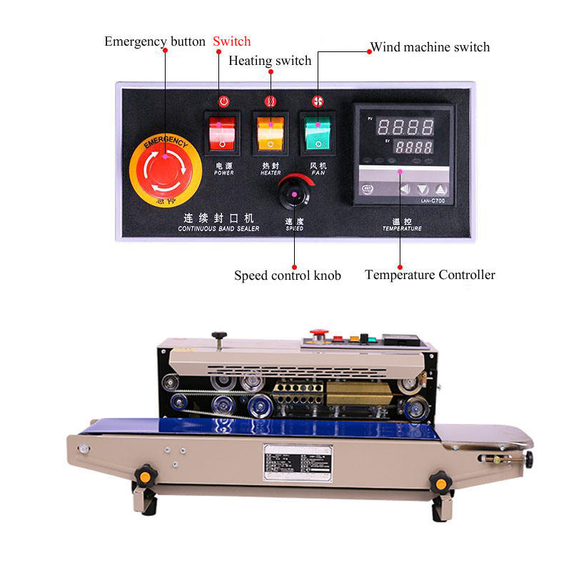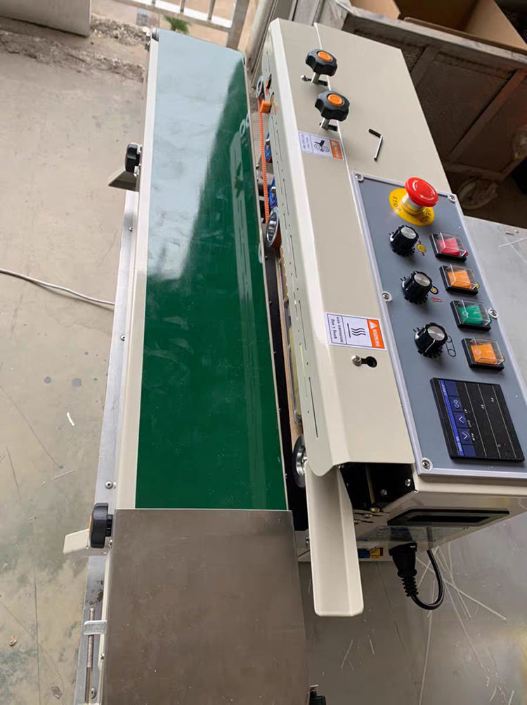 plastic packaging machine suitable for sealing, adopts electronic constant temperature control and stepless speed transmission mechanism, automatic and continuous sealing materials of plastic film, According to the need to also can configure creasing printed wheel and counting device. Features: 1. Adopt stepless speed control and electronic thermostat control device transmission mechanism. 2. Its sealing length is not restricted, high efficiency, reliable sealing quality, reasonable structure, easy to operate and so on. 3. Suitable for sealing packaging of various bags,and can connect with kinds of packaging lines. 4. Need to be heated before use.